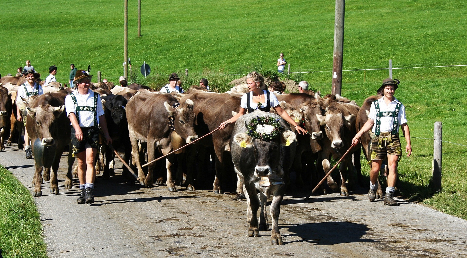 Die Herden werden dann ins Tal getrieben, wo sie von Einheimischen und Gästen bereits freudig erwartet werden. Die Leitkuh bekommt einen kunstvoll und aufwändig in Handarbeit gefertigten Kopfschmuck aus Bergblumen, Zweigen, Bändern und Tannengrün aufgesetzt. Auf diese Weise festlich geschmückt führt sie als Kranzrind die Herde an. Natürlich tragen auch die Hirten ein Festtagsgewand, nämlich traditionell eine Lederhose mit bestickten Edelweißhosenträgern.